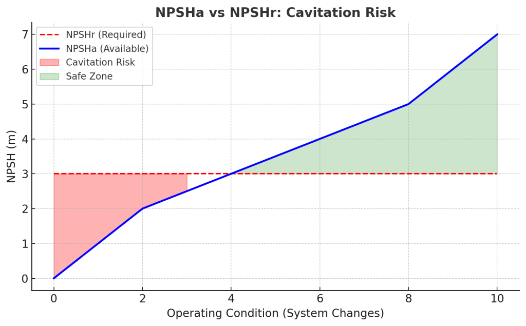 Wherever the blue line (NPSHa) is above the red line (NPSHr), the pump has enough suction pressure to prevent cavitation. - Red shaded zone (Cavitation Risk):